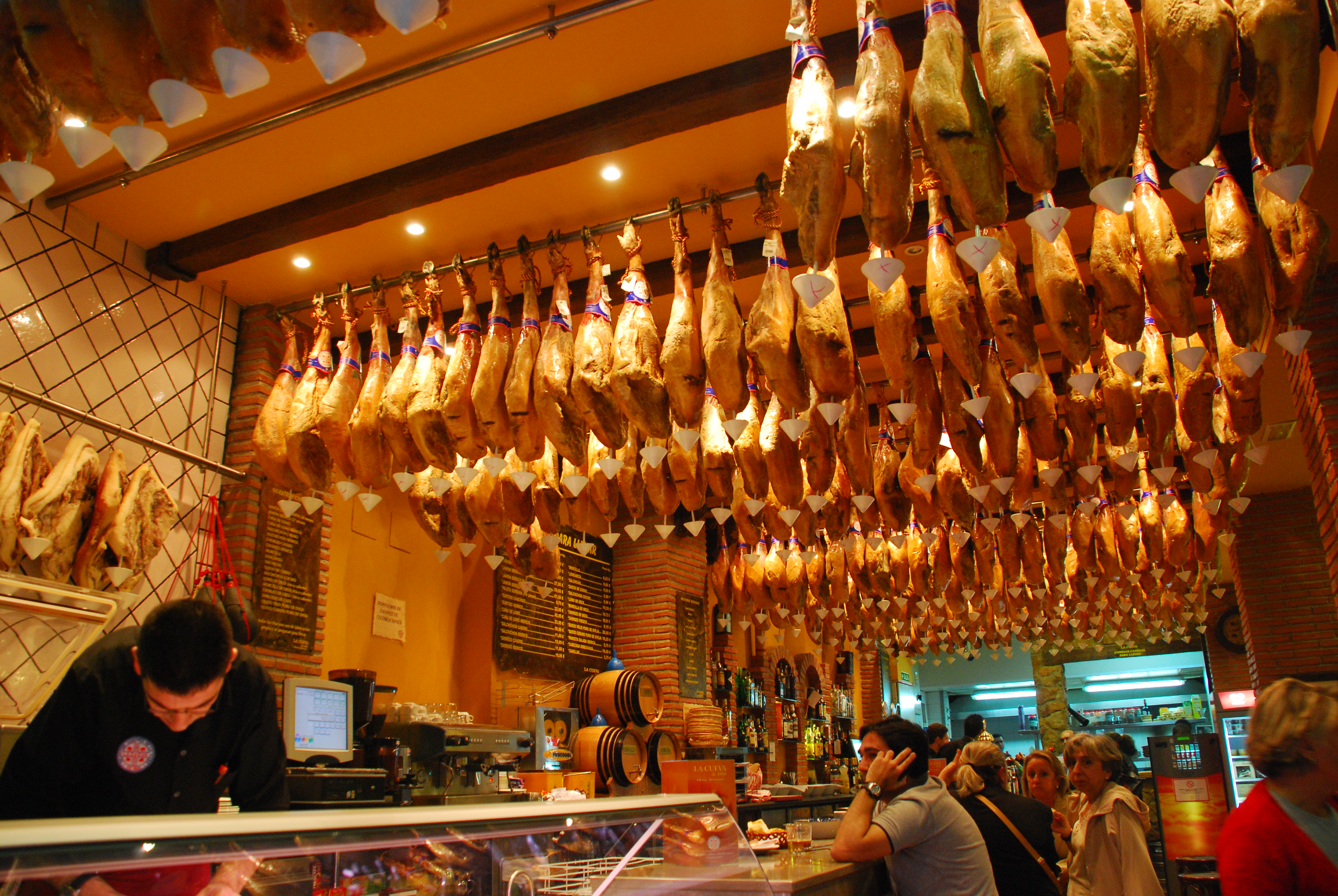 Domuz bacakları yeme-içme mekânlarının çoğunda asılı bir şekilde sergileniyor. Şarküterilerdeki görüntüler benim için başdöndürücü ve iştah açıcı. Belleğim babamın dükkanında ramazan aylarında askıya çıkan pastırmaların görüntüsünü ve ne akıldan ne bedenden kolay kolay çıkmayan kokusunu çağırıyor. Belki de bu yüzden tanıdık gelen bu görüntüler bir kez daha evimde hissetmem için bir dayanak oluyor. Domuz bacaklarının oda sıcaklığında saklanması gerektiği için sızan yağları insanların üstüne akmasın diye plastik yağ toplayıcılar asılarak engel olunuyor. Öte yandan bizde kasaptan bir but almak gibi değil parasal açıdan bu bacaklar. Ortalama 300-500 avro arasında bir meblağı gözden çıkarmak lazım.