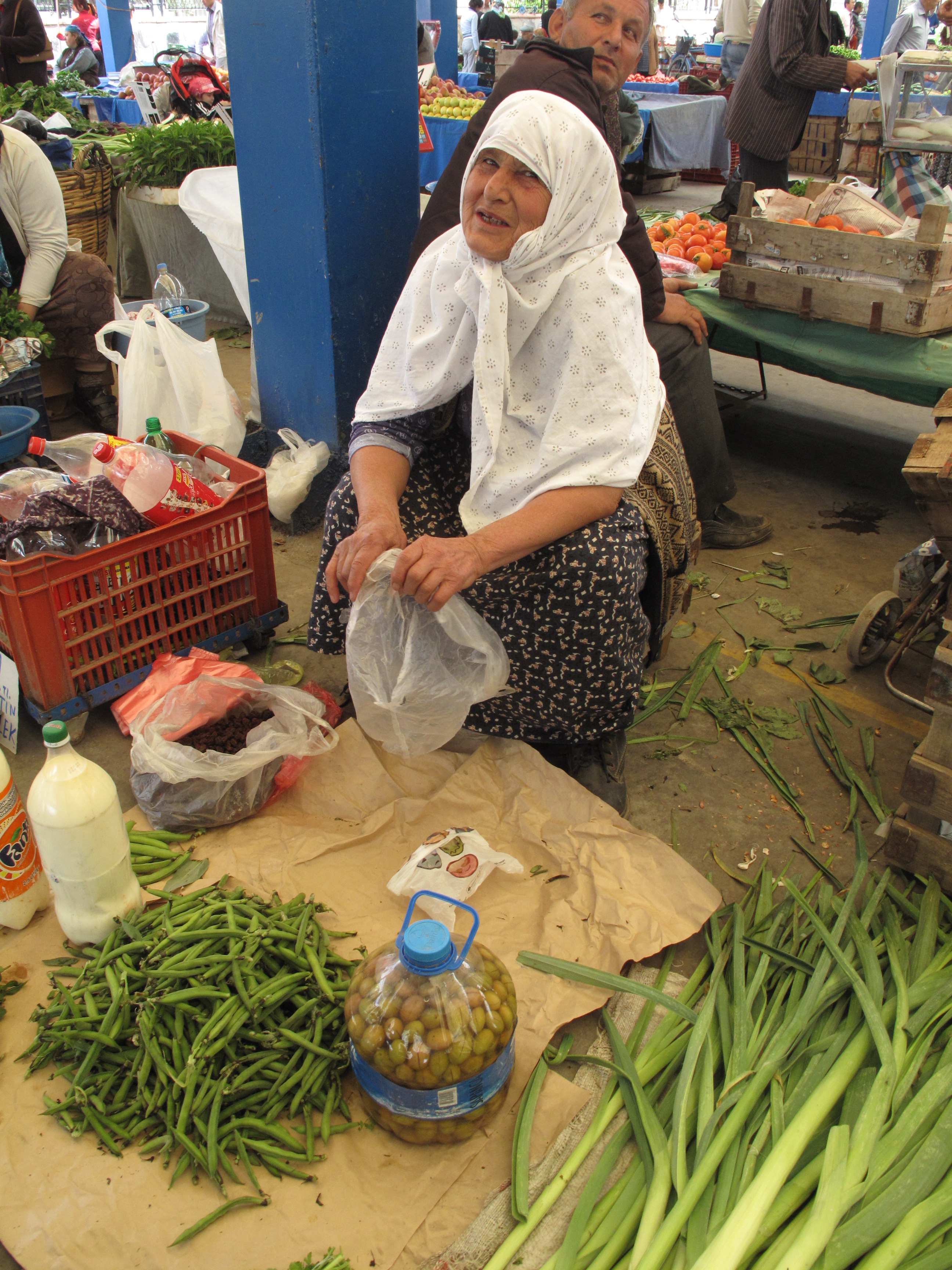 Zehra Teyze, Nazilli’deki müstakil bahçeli evimizin bulunduğu çamlı sokakta pazar kurulmaya başladığı 1980’lerin sonlarından 1990’ların sonlarına kadar kapımızın önünde yıllarca ürünlerini sergiledi. Her cumartesi komşumuz oldu. Şimdilerde belediyenin yaptığı üstü kapalı pazar yerinde oğlu Adnan Abi’yle ürünlerini satıyor. Hem üretiyorlar, hem pazarda ürünlerini satıyorlar. Aracısız, doğrudan müşteriye ulaşınca da hem daha güvenilir hem daha ucuz oluyor sebze, meyve ve süt ürünleri. Evinde bir-iki ineği olan tüm köy evlerinde geçimlik süt ürünleri de üretilir. Dolayısıyla temiz, pak köylü kadınlar akça pakça çökeleklerini, süzme yoğurtlarını, kaşıklarla desenler yaptıkları tereyağlarını da pazara getirip satarlar. Köyevi, bağevi bahçesinde serbestçe gezinen tavukların yumurtaları da pazarda değişim değeri kazanır.