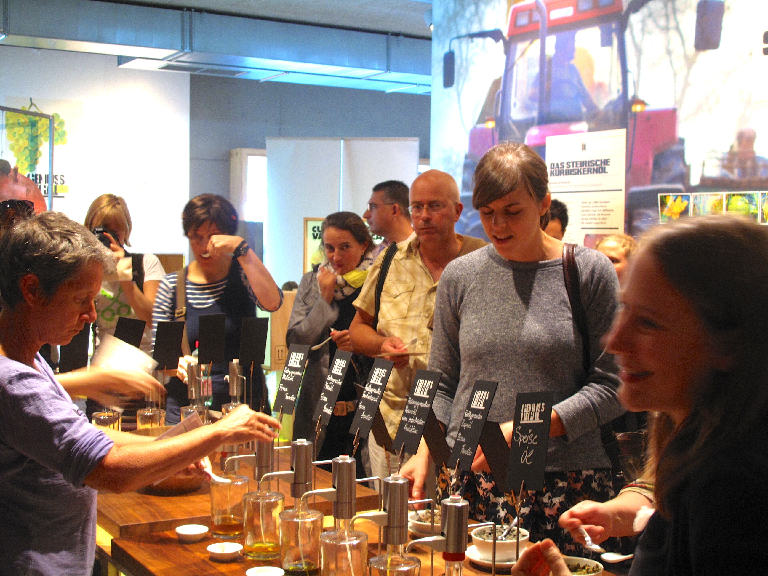 Excursiondaki ilk durağımız bölgenin üreticilerinin oluşturduğu kooperatif benzeri bir oluşumda 250 üreticinin 2500 ürünün tanıtımının ve satışının yapıldığı Genuss Regal VinoFaktür. Burada şarap dışında benim açımdan tattığım en orijinal şey kabak çekirdeği yağı oldu. Salatalarda zeytinyağına alternatif olarak farklı kavurma teknikleri ile tatlandırılan kabak çekirdeği yağı gerçekten üzerine düşünülmesi gereken bir ürün. Ayrıca farklı meyvelerden yapılan schnappsler.