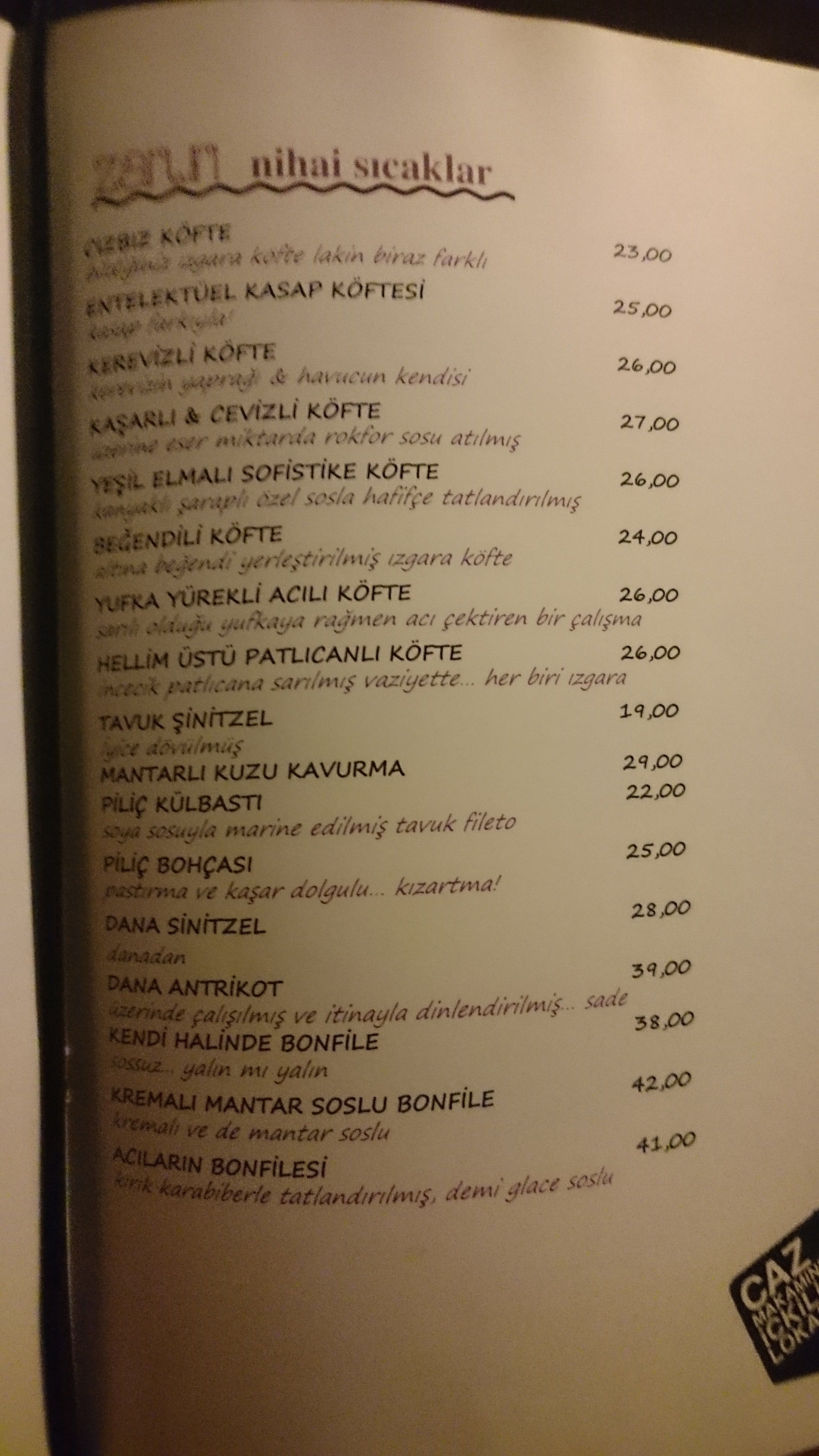 Esprili menüsü bombaydı. Entellektüel kasap köfte, kendi halinde bonfile, yufka yürekli acılı köfte gibi orijinal ana yemekler bir harikaydı. Ana yemeklerin görsel zenginliğine, lezzetlerine doyamamak böylesi harikulade mekânı Antalya’ya yolum düştükçe deneyimlemek zorunda kalmak bir işkence gibi adeta. Sırf Zaruri’ye gidip bir akşam yemeği yemek için, burayı keşfetmemize neden olan Antalya’daki dostları görmek, leziz sohbetlerine ortak olmak için bile gitmek isteyeceğim bir meyhane burası. Teşekkürler Cihan’cığım ve Gönül hocam.